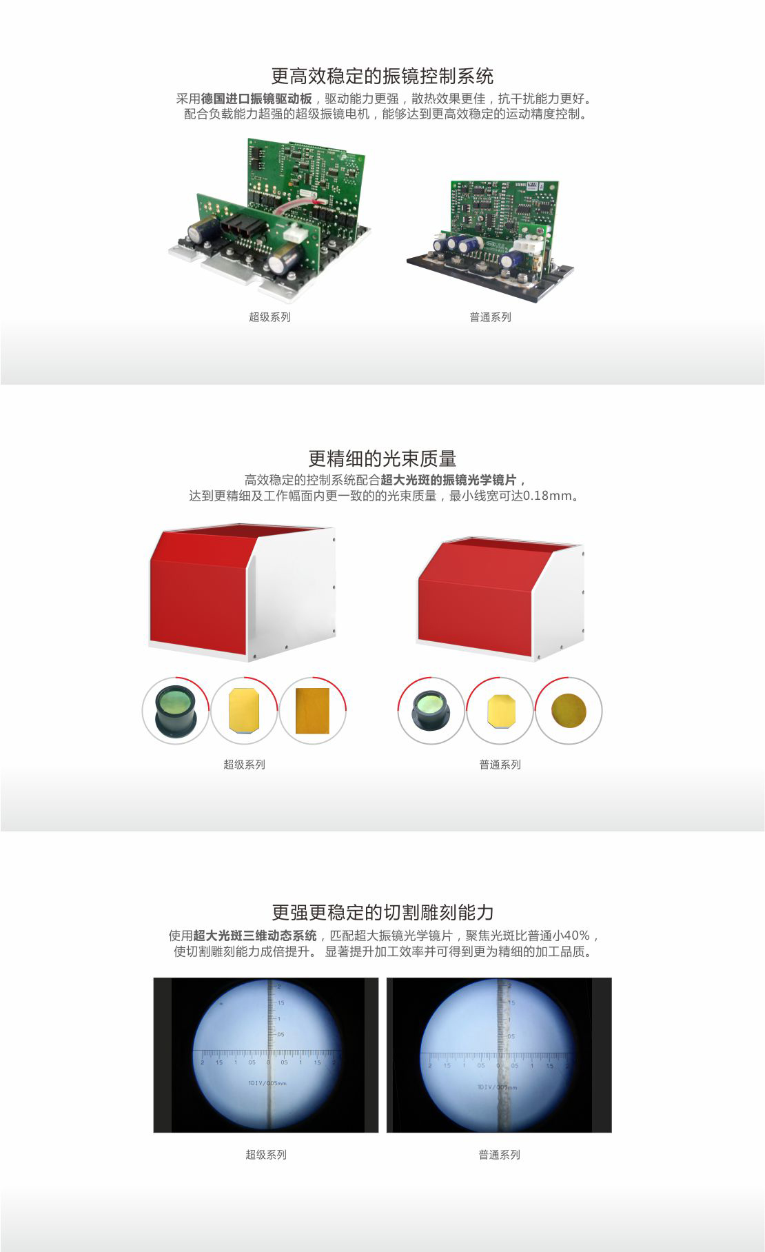 超級打標(biāo)機(jī)使用超大光斑三維動態(tài)系統(tǒng),加工速度比普通激光打標(biāo)機(jī)快25%-30%。配上強(qiáng)大的打標(biāo)軟件,使打標(biāo)速度可達(dá)10000mm/s,配上50光斑高速振鏡,更適合刻字膜大批量生產(chǎn)。