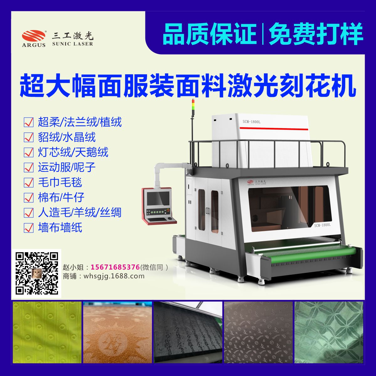該設備是利用激光的熱效應,無接觸的對面料進行燒灼刻蝕,并形成凸凹有致的花型圖案。